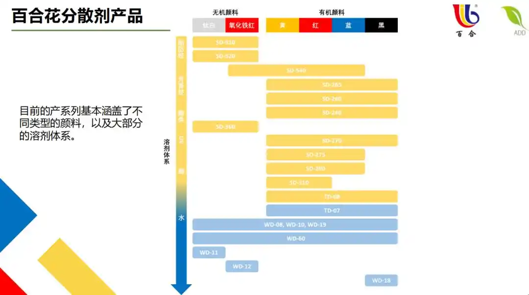目前公司的分散劑產(chǎn)品主要分為SD溶劑型、WD水性和TD高極性體系,三大系列產(chǎn)品。三系列產(chǎn)品的型號(hào)超過20支,適用于炭黑、鈦白粉、金屬顏料、有機(jī)紅黃等多種顏料的體系分散。