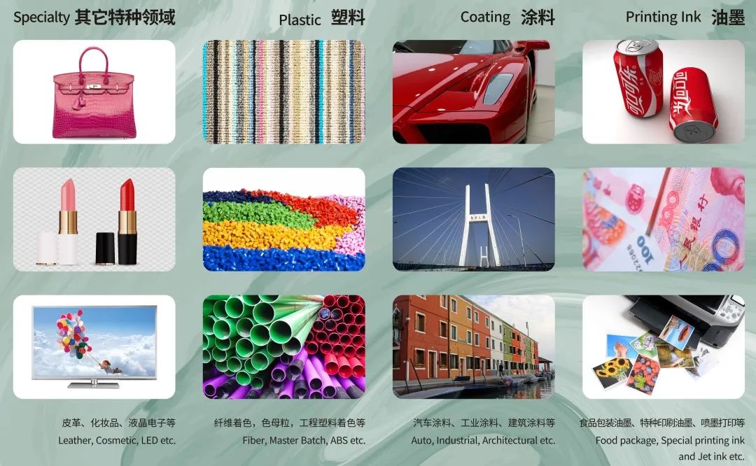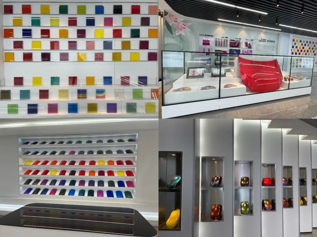 In the center of the exhibition hall, the product and application physical display area shows some products and application fields produced by the company, and the lily pattern on the background wall is also echoed by the lily Group. The product display area places various specifications of lily pigment products, which allows visitors to feel the quality of pigments at zero distance. The product application area shows the wide application of lily pigments in ink, coatings, plastics, leather, cosmetics, liquid crystal electronics and other special fields. In the field of ink, the company provides corresponding products for the coloring and anti-counterfeiting of RMB. In the field of coatings, the company's products are suitable for all kinds of high-end automotive paint and other coating products. Among them, the company earned the first bucket of gold in the main color of the construction of Nanpu Bridge, which laid a certain foundation for the rapid development of the company in the future. In the field of plastics, the company provides environmentally friendly pigments with low aromatic amines and no heavy metals, which solves the safety and environmental protection problems in plastic applications. In other special areas, we can see the application of sparkling pearlescent pigments in the field of cosmetics.