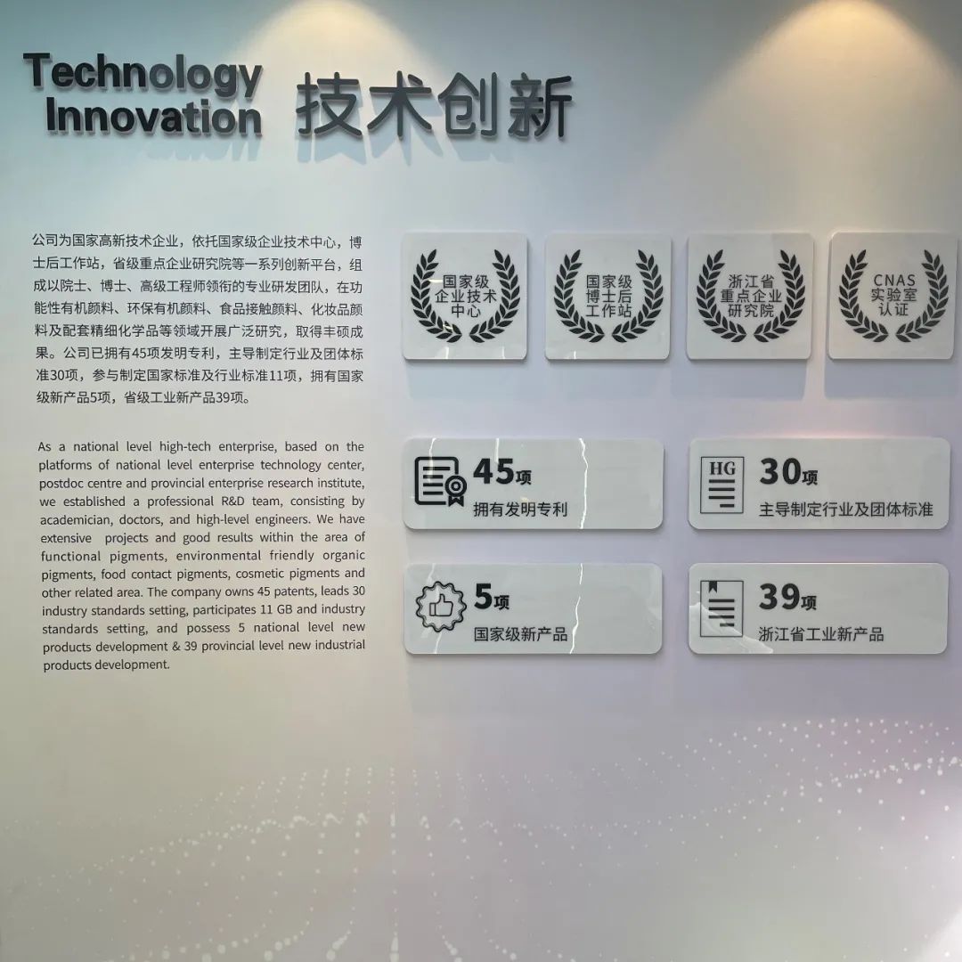The company's honor wall shows some of the honors the company has won over the years: National Enterprise Technology Center, Zhejiang Key Enterprise Research Institute, CNAS laboratory certification, etc. At the same time, Lily is also the vice president of China Coating Industry Association, China Dye Industry Association, the president of Zhejiang Coating Industry Association, Qiantang District Environmental Protection Association and Qiantang District Chamber of Commerce. This means that Lily has not only been recognized by departments at all levels and peers, but also has a larger platform to contribute its own strength, and there are more opportunities to lead the healthy development of the industry in the field of organic pigments.